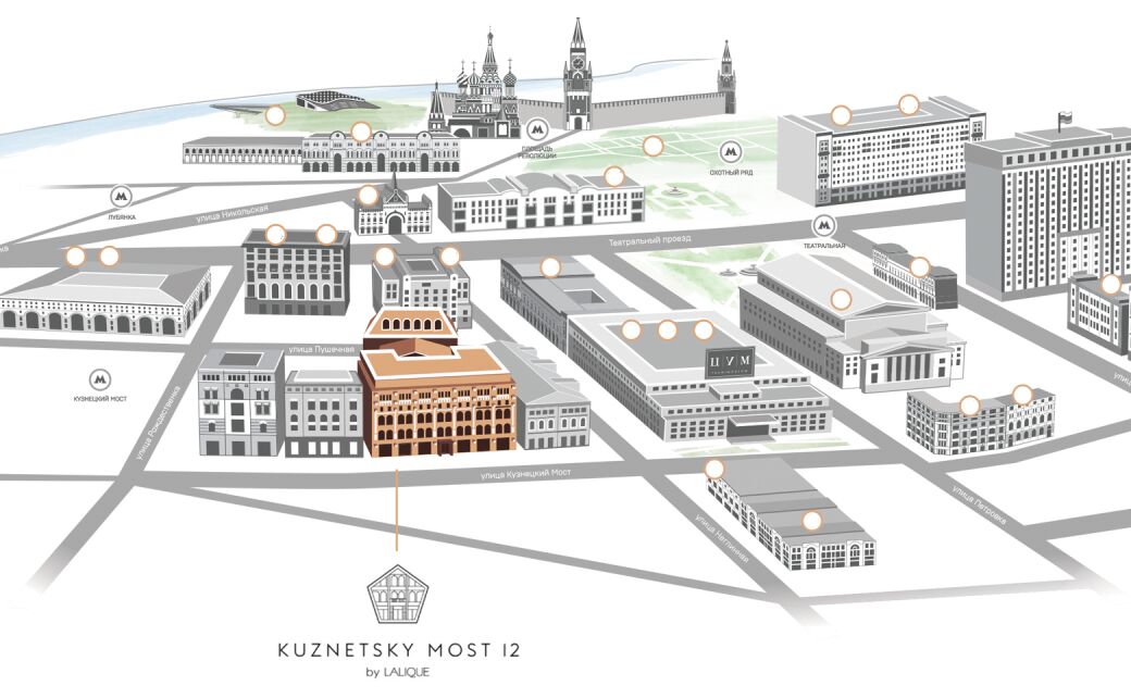 Проект « Kuznetsky Most 12 by Lalique» находится в Мещанском районе. Инфраструктура развита, в пешей доступности: кафе, рестораны, детские сды, школы, медицинские учреждения, магазины, банки. Большой театр и ЦУМ всего в 5 минутах пешком. Метро «Кузнецкий мост» также в 5 минутах пешком.