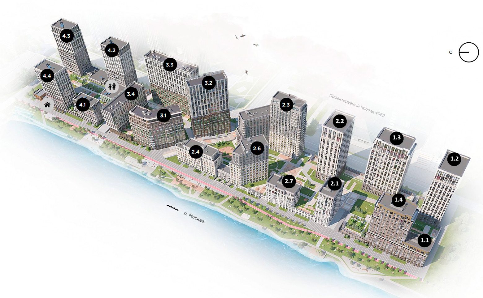 Всего запроектировано 100 планировочных решений от 1 до 4 комнат. Квартиры представлены как классическими, так и европланировками. Высота потолков составляет от 3 до 5,65 метров. Покупателям предложено несколько уникальных форматов жилья: Double floor — двухуровневые квартиры на верхнем этаже с потолками высотой 5,7 м, панорамными окнами и видами на Москву-реку. Top floor — пентхаусы с высотой потолков 4,5 м. City house — трехэтажный дом с видом на набережную и городской инфраструктурой рядом. Квартиры с террасами площадью от 6 до 36 кв.м, с саунами и окнами в ванных и гардеробных.