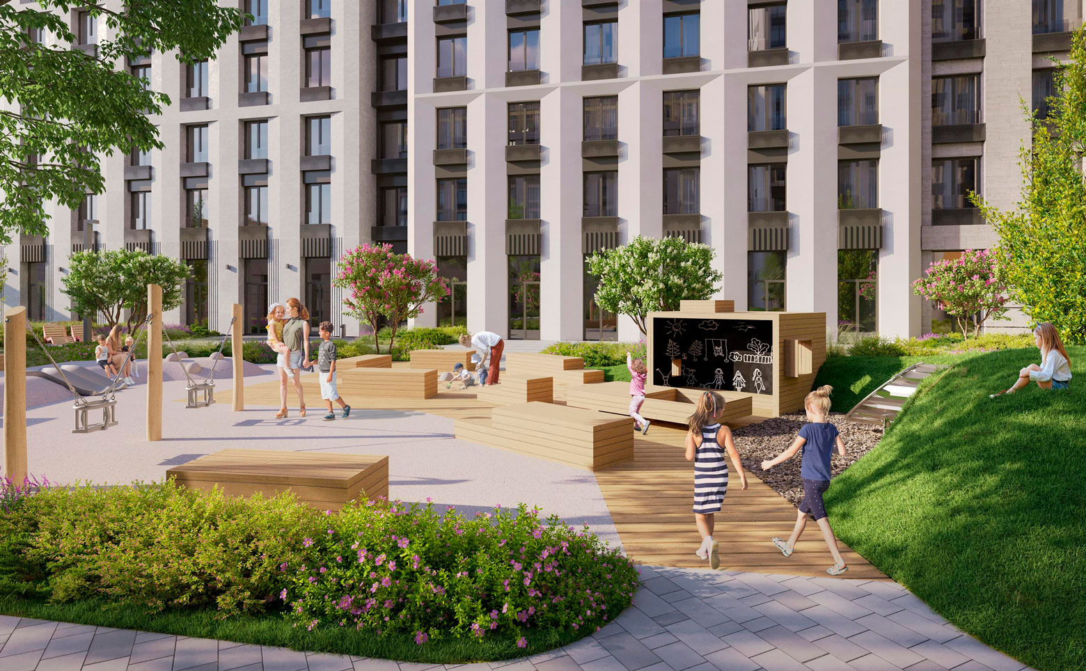 На первых этажах комплекса «Страна.Озерная» предусмотрены коммерческие помещения. Во дворе спроектированы прогулочные и фитнес зоны. Для детей разных возрастов оборудованы игровые площадки из природных материалов. Сердцем игрового пространства является многоуровневый детский комплекс с закрытой горкой.